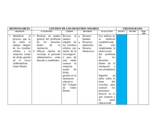 Este documento presenta un cronograma de actividades para implementar un plan de gestión de residuos sólidos en el Colegio Llano Bonito entre setiembre y abril. Los objetivos incluyen identificar el proceso actual de manejo de desechos, proponer acciones para facilitar un plan de gestión, y diseñar herramientas innovadoras para el plan. Algunas actividades son charlas de reciclaje, crear brigadas estudiantiles de vigilancia, y habilitar un área temporal de acopio. Los recursos requeridos son humanos, materiales