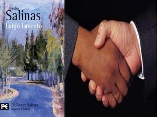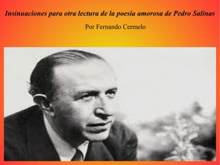 Este documento proporciona un resumen de las insinuaciones para otra lectura de la poesía amorosa de Pedro Salinas. El autor, Fernando Cermelo, argumenta que a pesar de que las frases de amor se repiten en la poesía de Salinas, nunca son exactamente las mismas. Además, sugiere que no hay que cansarse de repetir palabras iguales. El documento incluye varias referencias bibliográficas.