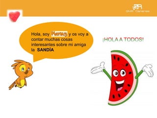 La sandía es una planta herbácea de tallo peludo y suave que produce flores amarillas y frutos esféricos, jugosos y de corteza verde o con franjas. Contiene mucha agua que ayuda a mantenerse hidratado y reduce la sed en verano, también estimula los riñones y baja el colesterol. Para saber si una sandía está madura hay que darle golpes y escuchar el sonido hueco que debe producir.