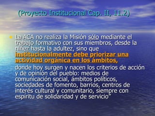 El documento describe los objetivos y actividades de la Comisión Nacional del Área Sectores de la Acción Católica Argentina. La comisión busca extender la presencia de la Iglesia Católica en sectores sociales como educación, política, comunicaciones y trabajo a través de proyectos, formación y colaboración con otras organizaciones. Describe también la organización de equipos a nivel diocesano y parroquial enfocados en diferentes sectores.
