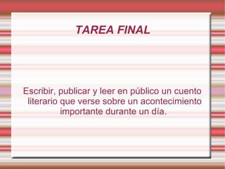 Este documento presenta una secuencia didáctica de 8 sesiones para la asignatura de Lengua y Literatura de 3o de ESO. El objetivo es que los alumnos aprendan a contar historias sobre días mediante la escucha de canciones, la lectura de cuentos y la escritura de su propio cuento literario que presentarán al final del curso. Las sesiones incluyen actividades como análisis de letras musicales, escritura de relatos breves y aprendizaje sobre elementos de la narración.