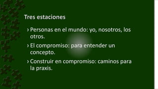 El documento aborda la importancia del compromiso y la colaboración para construir un mundo común, destacando historias como la de América, quien busca aprender a leer y escribir a pesar de las adversidades. Además, se menciona un esfuerzo colectivo de estudiantes y maestros en Querétaro para fundar una escuela, evidenciando la necesidad de educación en la comunidad. Se enfatiza que el compromiso implica una conexión profunda con otros, realizando acciones concretas para el cambio social y el desarrollo personal.