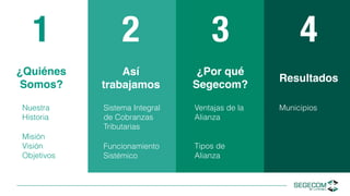 Segecom es una empresa venezolana fundada en 2001 que ofrece servicios de recaudación de impuestos municipales. Trabajan con municipios para mejorar sus sistemas de recaudación tributaria mediante el uso de tecnología, personal capacitado y gestión activa de cobranzas. Sus servicios han ayudado a aumentar sustancialmente la recaudación de impuestos en varios municipios y fortalecer su gestión financiera.