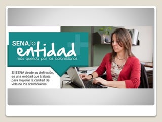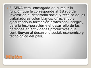 El SENA tiene la misión de ofrecer formación profesional integral a los trabajadores colombianos para contribuir al desarrollo del país. Su visión es ser una entidad líder mundial en formación profesional e innovación al servicio de empresas y personas para 2020. El escudo, bandera y logotipo representan los sectores económicos en los que se enfoca el SENA.