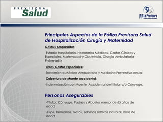 La póliza ofrece cobertura para gastos de hospitalización, cirugía, maternidad, gastos médicos mayores, muerte accidental y enfermedades críticas. Cubre al titular, cónyuge, padres, hijos y otros familiares. Incluye servicios como carta de aval y clave de emergencia. Tiene plazos de espera y exclusiones temporales para algunas condiciones.