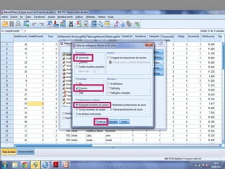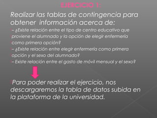 Este documento presenta los resultados de tres tablas de contingencia realizadas para analizar la relación entre diferentes variables. La primera tabla muestra que existe una relación entre el tipo de centro educativo del que proviene el alumnado y su elección de enfermería como primera opción. La segunda tabla indica que no existe una relación entre elegir enfermería como primera opción y el sexo del alumnado. La tercera tabla demuestra que sí existe una relación entre el gasto mensual en el móvil y el sexo.