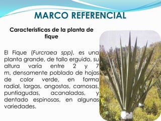 Este documento describe alternativas agroindustriales para el fique en el departamento de Nariño, Colombia. Presenta información sobre las características y especies cultivadas de fique, el proceso de beneficio, y los subproductos generados como el bagazo, jugo y estopa. Propone utilizar estos subproductos para elaborar bioplaguicidas, alimento para animales, abono orgánico y biomantos para control de erosión. Incluye ejemplos del cultivo de acelga y repollo usando abono orgánico de fique y comparaciones