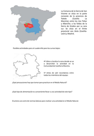 Este documento describe una ruta educativa en el medio natural de la Comarca de la Sierra de San Vicente en Castilla-La Mancha. Explica la ubicación de la zona y propone actividades para estudiantes sobre la flora, fauna y monumentos históricos que se pueden encontrar a lo largo de la ruta, incluyendo árboles comunes, un pozo de nieve, vistas del valle y formaciones rocosas.