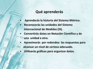 El documento presenta el Sistema Internacional de Unidades (SI) para la medición. Explica las unidades básicas del SI para longitud, masa, tiempo y otras magnitudes. Describe la historia del sistema métrico y cómo evolucionó hacia el SI. También define las unidades derivadas comunes como el volumen y las conversiones entre unidades.