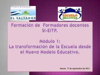 Este documento presenta la metodología y contenidos de un taller de capacitación para docentes sobre el nuevo modelo educativo y la escuela inclusiva de tiempo pleno. El taller consta de dos fases, una presencial de 16 horas que integra teoría y práctica a través de reflexión-acción, y otra no presencial de 24 horas de autoestudio y elaboración de una propuesta pedagógica. El módulo se divide en tres unidades sobre rediseño de la escuela, educación inclusiva y escuela inclusiva de tiempo pleno, con activ