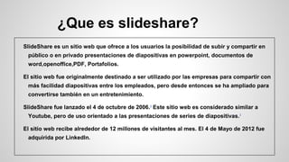 Este documento presenta una introducción a SlideShare, un sitio web que permite a los usuarios compartir presentaciones de diapositivas. Explica cómo funciona SlideShare, los requisitos para registrarse y acceder al sitio, y las ventajas y desventajas de utilizar esta herramienta.