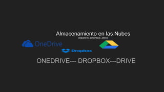 Google Drive es un servicio de almacenamiento en la nube de Google que ofrece 15 GB de espacio gratuito y permite editar documentos desde cualquier dispositivo. Dropbox es un servicio gratuito que sincroniza y comparte archivos entre dispositivos, mientras que OneDrive permite almacenar archivos en la nube de Microsoft.