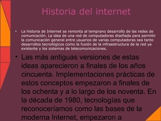 El documento resume la historia del desarrollo de Internet desde las primeras redes de comunicación en la década de 1950 hasta su expansión mundial en la década de 1990. Las ideas fundamentales de interconectar computadoras surgieron en la década de 1950 y se implementaron prácticamente en la década de 1980, dando lugar a las bases técnicas de Internet. Internet luego se extendió por todo el mundo para crear la red global de computadoras que conocemos hoy.