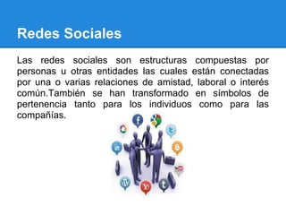 Este documento presenta las ventajas y desventajas de las redes sociales. Algunas ventajas son que permiten la colaboración y el aprendizaje, facilitan la reunión con conocidos y diluyen las fronteras geográficas. Algunas desventajas son que no todos tienen acceso a la tecnología, pueden darse casos de falsificación de identidad, y pueden ser adictivas y consumir mucho tiempo. El documento concluye que las redes sociales han llegado para quedarse y cambiar la forma en que nos relacionamos,