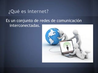 Internet es un conjunto de redes interconectadas que permite a los usuarios buscar información, comunicarse, jugar en línea, compartir archivos y descargar contenido. La Web utiliza un sistema de distribución basado en hipervínculos para enlazar páginas, mientras que el correo electrónico y la mensajería instantánea permiten la comunicación en línea. Los servidores proveen servicios a las computadoras clientes y cada dispositivo en la red tiene una dirección IP única, mientras que los servidores DNS traducen los nombres de dominio