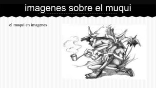 El documento habla sobre el muqui, un duende de la mitología andina que se caracteriza por vivir en las minas subterráneas. Según la leyenda, el muqui habita en el interior de las minas y su nombre proviene de palabras quechuas que significan "el que asfixia" o "el que es asfixiado". Los antiguos mineros asociaban al muqui con el sílice, un polvo letal que causa la enfermedad de la silicosis.
