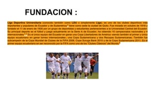 El documento proporciona información sobre el club de fútbol Liga de Quito de Ecuador. Fue fundado en 1930 por estudiantes y deportistas de la Universidad Central del Ecuador. Ha ganado 10 campeonatos nacionales y 4 internacionales, incluyendo la Copa Libertadores de 2008, siendo el primer equipo ecuatoriano en ganar un torneo internacional importante. Actualmente juega en la Serie A de Ecuador y su sede principal es la ciudad de Quito.