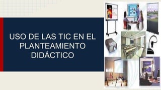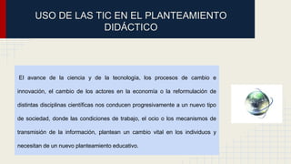 Este documento discute el uso de las tecnologías de la información y la comunicación (TIC) en la enseñanza. Explica que las TIC pueden crear entornos de aprendizaje más flexibles y eliminar barreras espacio-temporales entre profesores y estudiantes. También pueden fomentar el aprendizaje independiente, colaborativo y a lo largo de la vida. Finalmente, las TIC están transformando los procesos de enseñanza y aprendizaje hacia un nuevo modelo didáctico integrador basado en la comunicación en
