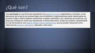 Las redes sociales son formas de representar estructuras sociales mediante la conexión de nodos que representan individuos u organizaciones relacionados. Se clasifican en redes sociales horizontales, que permiten una participación general, como Facebook y Twitter, y redes verticales, que se enfocan en un interés en común como redes profesionales o de ocio. Las redes sociales sirven como plataformas para la comunicación, el intercambio de información y la participación ciudadana a través de varios dispositivos.