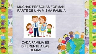 El documento describe los diferentes miembros de una familia típica, incluyendo abuelos, padres, tíos, primos y cómo el autor se relaciona con ellos como nieto y sobrino. Explica que cada familia es única y está compuesta por diferentes generaciones que están conectadas entre sí.