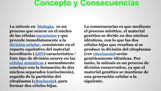 La mitosis es un proceso de división celular en el que el material genético se divide en dos núcleos idénticos. Consta de varias etapas: interfase para preparar la división, profase donde se condensan los cromosomas, metafase donde se alinean en la placa ecuatorial, anafase donde se separan los cromosomas hermanos, telofase donde se forman los dos nuevos núcleos, y citocinesis donde se divide el citoplasma para formar dos células hijas genéticamente idénticas.