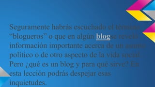 El documento explica qué es un blog y para qué sirve. Un blog es una página web en la que se publican regularmente artículos cortos sobre temas específicos. Los blogs permiten a las personas expresar sus ideas, intereses y opiniones. Aunque originalmente los blogs eran espacios personales, ahora gran parte de la información en internet se encuentra en blogs creados por personas de diferentes edades y profesiones.