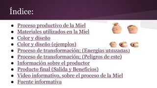 El documento describe el proceso de producción de la miel. Detalla los materiales utilizados para extraer y preparar la miel, como ahumadores, bombas de paletas y azúcares. Explica que el proceso utiliza energías eléctrica, térmica y calórica, pero presenta pocos peligros. Finalmente, señala que el producto final, la miel, ofrece beneficios para la salud como tratar heridas, reducir el colesterol y ayudar a la digestión.