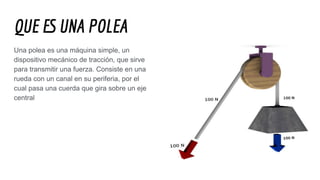 Una polea es un dispositivo mecánico que consiste en una rueda con un canal para una cuerda, que sirve para transmitir fuerza de manera más eficiente. Las poleas pueden ser fijas, móviles, compuestas o formar parte de un polipasto. Cumplen funciones como elevar cargas con menor esfuerzo o permitir su desplazamiento vertical.