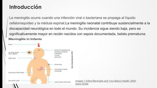 La meningitis bacteriana neonatal es una grave infección del líquido cefalorraquídeo y la médula espinal causada principalmente por bacterias como el estreptococo del grupo B, E. coli y Listeria monocytogenes transmitidas de la madre al bebé. Los síntomas, diagnóstico e impacto son especialmente graves en recién nacidos prematuros o con sepsis. El examen del líquido cefalorraquídeo y hemocultivos son cruciales para el diagnóstico, y la detección rutinaria de estreptococo del grupo