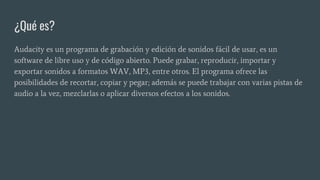 Audacity es un programa de código abierto gratuito para grabar y editar audio. Permite grabar sonido desde micrófonos u otros dispositivos, importar y exportar archivos de audio en varios formatos como WAV y MP3, y editar sonido en múltiples pistas aplicando efectos. Sus características incluyen edición de sonido, grabación en varios canales simultáneamente, y la capacidad de extender sus funciones a través de plugins.