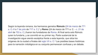 Según la leyenda, los gemelos Rómulo y Remo fueron abandonados en el río Tíber tras nacer de una virgen vestal, pero fueron amamantados por una loba y criados por un pastor. Cuando crecieron, mataron al rey Amulio y liberaron a su abuelo Numitor. Rómulo y Remo fundaron Roma, pero discutieron sobre dónde construirla y Remo murió durante la pelea que siguió. Rómulo estableció Roma oficialmente el 21 de abril de 753 a.C