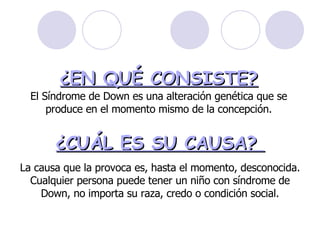 El documento aborda el síndrome de Down, explicando que es una alteración genética provocada por un cromosoma extra en el par 21, y menciona que su frecuencia es de aproximadamente 1 por cada 1.000 nacimientos. Se destaca que las personas con este síndrome pueden llevar vidas independientes con el apoyo adecuado y que el 75% de ellos asisten a colegios ordinarios en España. Además, se ofrecen sugerencias para trabajar con alumnos con síndrome de Down, enfatizando la importancia de adaptar las actividades y utilizar estímulos afectivos.