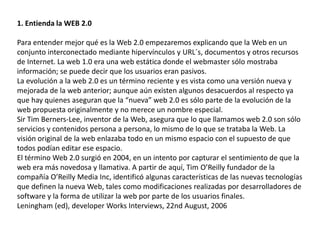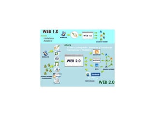La Web 2.0 se refiere a la evolución de la Web hacia una versión más interactiva donde los usuarios dejan de ser pasivos y pueden crear y modificar contenido. Los blogs (sitios web donde se publican artículos de forma cronológica) han pasado a ser una herramienta importante en la Web 2.0, permitiendo a los usuarios escribir y comentar de forma fácil. Los blogs ofrecen varias ventajas para la educación como permitir comentarios, archivar contenido y compartir diferentes tipos de medios.