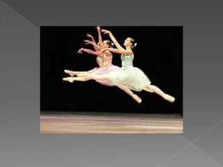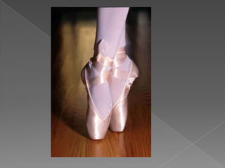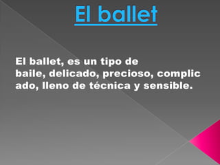 El documento habla sobre los métodos y técnicas del ballet clásico. Explica que el ballet enseña sus movimientos a través de métodos específicos y que cada paso está estructurado de manera precisa, involucrando todo el cuerpo. También describe los principales movimientos y posiciones del ballet como la primera, segunda y tercera posición, y recomienda la edad ideal de 7 años para comenzar los estudios, aunque nunca es tarde para aprender.