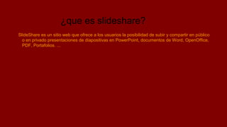 SlideShare es un sitio web que permite a los usuarios subir y compartir presentaciones de diapositivas, documentos y PDF. Los usuarios pueden crear una cuenta gratuita para subir archivos y las presentaciones se convierten a formato Flash para ver online o en pantalla completa. SlideShare ofrece ventajas como compartir fácilmente presentaciones grandes y enviar enlaces, pero tiene desventajas como no admitir animaciones o combinar sonido e imagen.