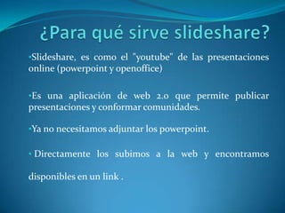 Slideshare es un servicio web que permite a usuarios publicar, ver y compartir presentaciones en formato PowerPoint u otros formatos. Los usuarios pueden crear una cuenta en slideshare.net, cargar sus presentaciones, añadir títulos, etiquetas y descripciones, y luego publicarlas para que otras personas puedan verlas y compartirlas en línea.