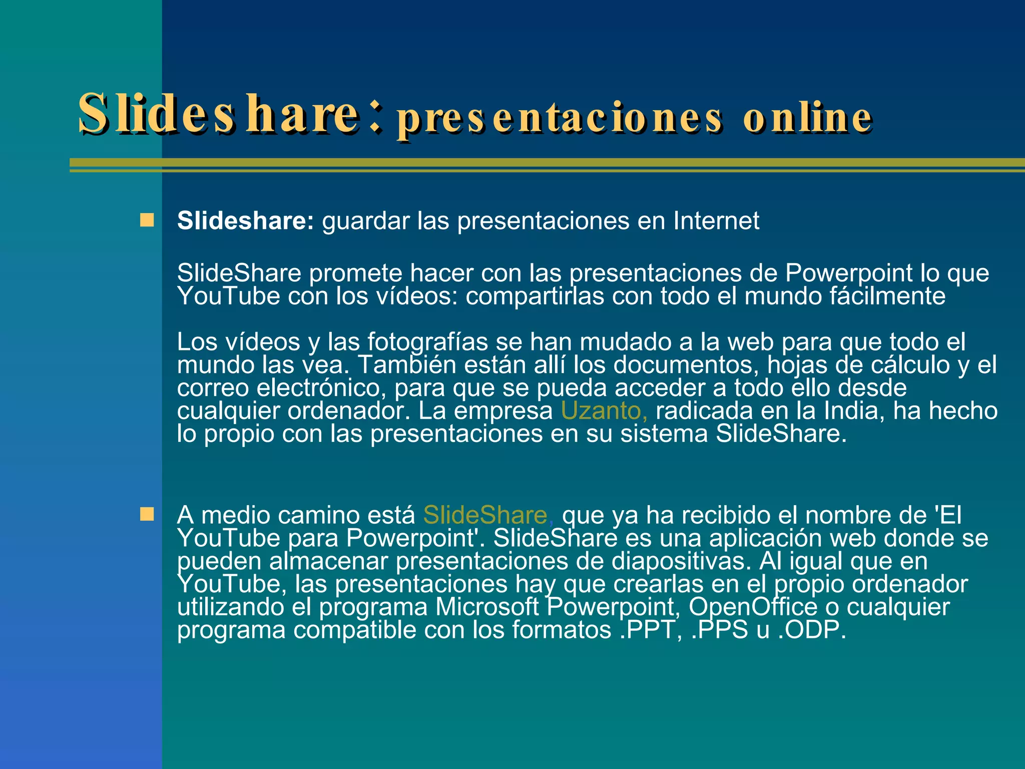 SlideShare es una plataforma en línea para compartir presentaciones de PowerPoint. Los usuarios pueden subir sus presentaciones a SlideShare, donde otras personas podrán verlas y compartirlas fácilmente de manera similar a cómo YouTube permite compartir videos. El documento explica los pasos para crear una cuenta en SlideShare, subir una presentación de PowerPoint, copiar el código embed para publicarla en un blog, e ingresar al blog y pegar el código para publicar la presentación allí.
