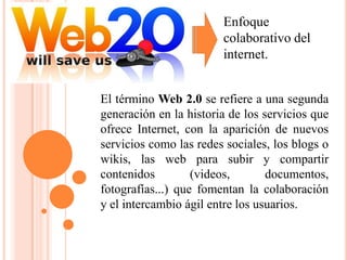 El documento describe el enfoque colaborativo de la Web 2.0, que permite a los usuarios interactuar y compartir contenidos de forma dinámica. La Web 2.0 incluye servicios como redes sociales, blogs y wikis que fomentan la participación y el intercambio entre usuarios. Esto ha generado nuevas aplicaciones educativas como blogs educativos y wikis que implementan formas más colaborativas de aprendizaje.