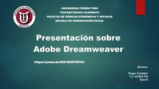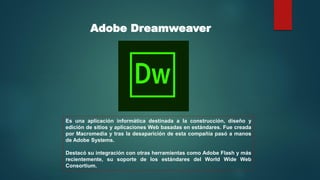 Adobe Dreamweaver es un programa para diseñar y editar sitios web que sigue estándares. Fue creado originalmente por Macromedia y ahora es propiedad de Adobe. Ofrece herramientas avanzadas para desarrollar sitios web como la capacidad de insertar botones flash, formularios y JavaScript, así como importar datos de Word y Excel. Aunque puede parecer complejo, Dreamweaver proporciona herramientas intuitivas para crear páginas web de forma sencilla.
