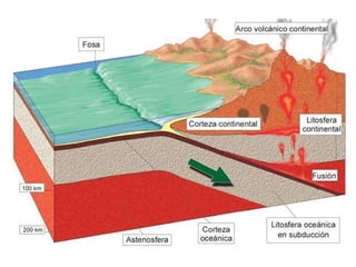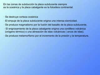 En las zonas de subducción, la placa oceánica se introduce bajo la placa continental, causando intensa sismicidad y la formación de cordilleras volcánicas como los Andes. Este proceso también genera magmatismo y metamorfismo a medida que la corteza oceánica se destruye y los sedimentos marinos se levantan. El roce entre las placas crea volcanes continentales y prismas de acreción en el borde de convergencia.