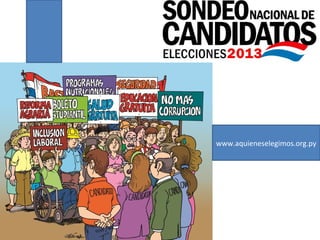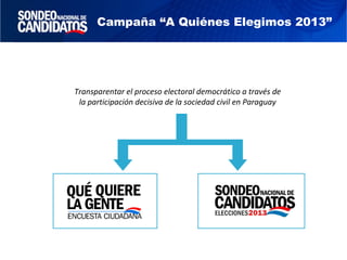 El documento detalla la campaña '¿A quiénes elegimos 2013?' en Paraguay, que busca transparentar el proceso electoral mediante la participación de la sociedad civil y entrevistas a 150 candidatos. Incluye comparaciones de datos de candidaturas entre los años 2008 y 2013, abordando temas como el perfil de los candidatos, financiamiento de campañas y opiniones sobre la reforma constitucional. También se analizan posiciones sobre temas políticos actuales, como la reelección presidencial y la pertenencia de Paraguay al Mercosur.