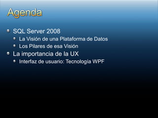 El documento habla sobre las características y capacidades de SQL Server 2008. Menciona que SQL Server 2008 ofrece una plataforma de datos empresarial que incluye características como seguridad y rendimiento mejorados, desarrollo dinámico con entidades, almacenamiento de diferentes tipos de datos más allá de lo relacional, y soporte para integración de datos y Business Intelligence.