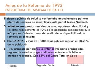 Antes de la reforma de 1993, el sistema de salud colombiano era inequitativo e insolidario. La cobertura era baja y el acceso dependía de la capacidad de pago. Tras la reforma de 1993 y la creación del Sistema General de Seguridad Social en Salud, el acceso es ahora un derecho para todos los colombianos de manera equitativa y solidaria. Aunque se han logrado ampliar la cobertura y mejorar la equidad, todavía existen desafíos como mejorar la claridad del Plan Obligatorio de Salud y fortalec