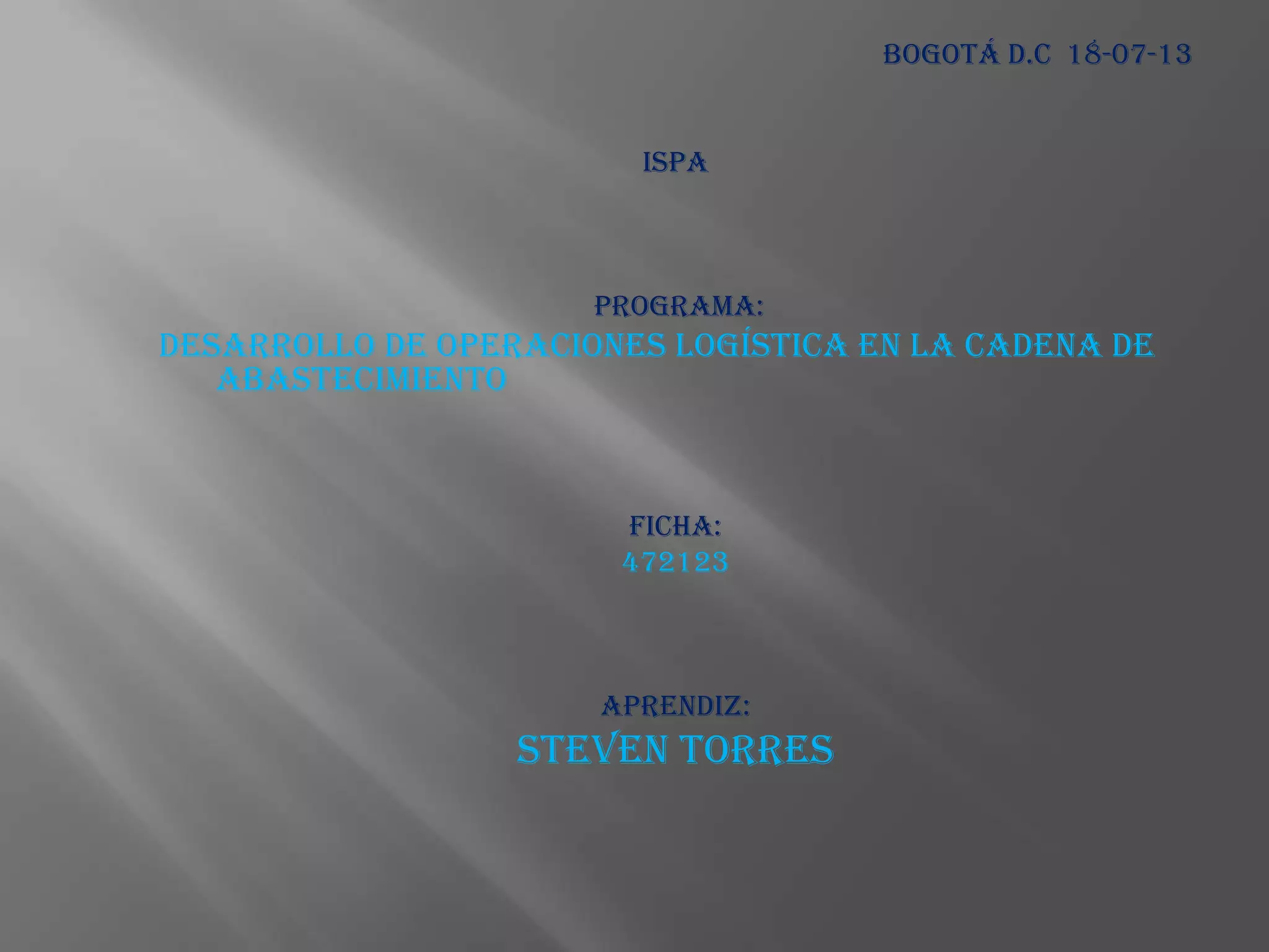 El documento presenta la ficha de Steven Torres, un aprendiz del Instituto San Pablo Apostol que está vinculado a un programa de Desarrollo de Operaciones Logísticas en la Cadena de Abastecimiento. El programa se enfoca en organizar inventarios y distribuir productos de manera eficiente. El proceso logístico involucra la planificación, implementación y control del flujo de materiales desde el origen hasta el destino final para satisfacer a los clientes con los menores costos posibles.