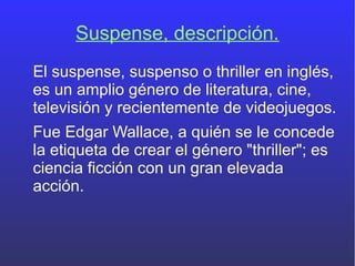 El documento describe el género cinematográfico del suspenso. Se caracteriza por tener un ritmo rápido, acción frecuente y héroes ingeniosos que frustran los planes de villanos poderosos. Las películas de suspenso suelen ocurrir en lugares exóticos y tienen héroes duros como policías o espías que enfrentan peligros. El suspenso se solapa con el misterio pero se distingue por enfocarse en frustrar los planes de un enemigo en lugar de resolver un crimen pasado.
