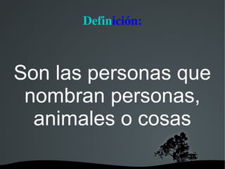 Este documento define el sustantivo como una palabra que nombra personas, animales o cosas. Explica que los sustantivos tienen género (masculino o femenino), número (singular o plural), y pueden ser propios, comunes, simples, compuestos, abstractos o concretos.