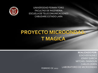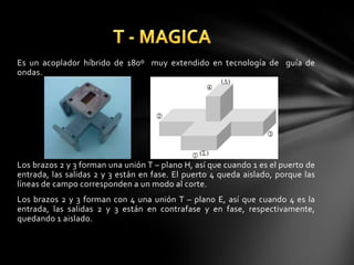 Este documento presenta información sobre un acoplador híbrido de 180° utilizado en tecnología de guía de ondas. Explica que cuando la entrada está en el puerto 1, las salidas 2 y 3 están en fase, mientras que el puerto 4 está aislado. Cuando la entrada está en el puerto 4, las salidas 2 y 3 están en contrafase y en fase respectivamente, mientras que el puerto 1 está aislado. También incluye especificaciones técnicas de varios modelos de acopladores híbridos con diferentes rangos de f