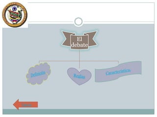 El documento presenta la definición y características de un debate. Se define el debate como una discusión formal y organizada que enfrenta dos posiciones opuestas sobre un tema, con la participación de dos grupos que defienden posturas distintas y un moderador. El debate se caracteriza por requerir conocimiento sólido del tema por parte de los participantes y discutir el tema de manera directa dentro de las reglas establecidas.