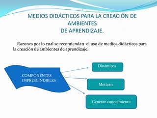 Este documento discute los recursos educativos y medios didácticos para crear ambientes de aprendizaje, incluyendo recursos pre-tecnológicos, tecnológicos, audiovisuales y las tecnologías de la información y comunicación. También describe los servicios de Internet como la red mundial, correo electrónico, foros de discusión y conversaciones electrónicas, así como recomendaciones sobre el uso seguro de Internet.