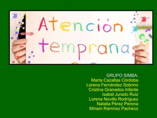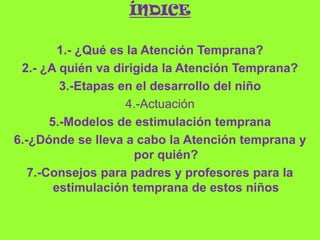 Este documento habla sobre la atención temprana dirigida a niños de 0 a 6 años con riesgo de desarrollo. Explica que la atención temprana detecta y responde a las necesidades de los niños a través de la intervención multidisciplinar. Se lleva a cabo en centros de desarrollo infantil, servicios sanitarios y educativos, trabajando con los padres y cuidadores mediante diferentes modelos como el déficit compensatorio y el ecológico. El objetivo es estimular el desarrollo del niño de forma